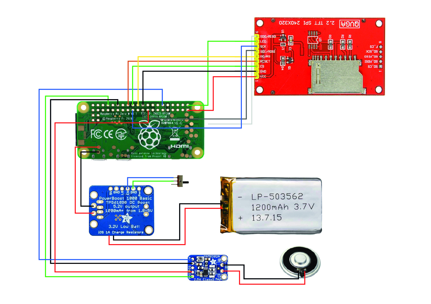 1200mAh 3.7 v LiPo Battery – I used a PKCell LP503562 1200mAh 3.7v from Pimoroni, but the linked version should work fine.